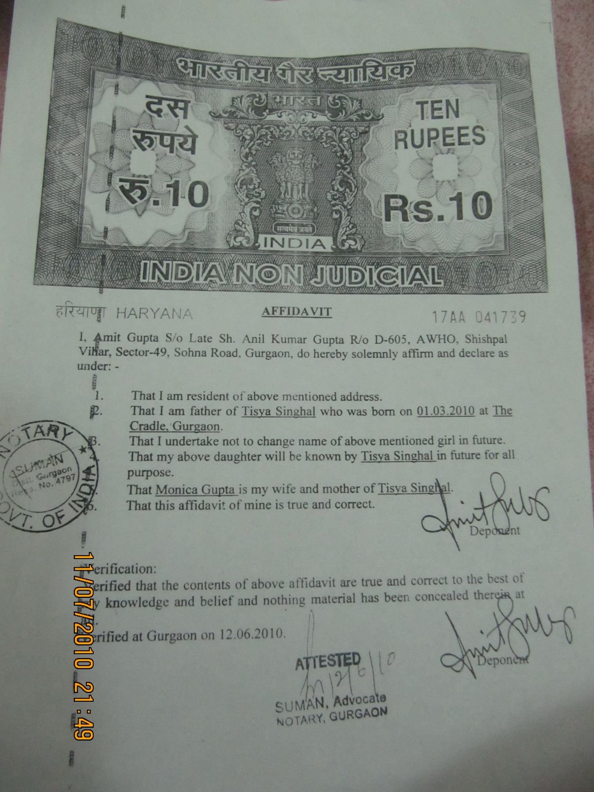 The application format was pasted outside the clerk window in both English and Hindi, but he would accept the application only filled in Hindi and that too without child’s name. Once a certificate without name is issued then a affidavit needs to be submitted stating that child name will not be changed in future to get a birth certificate with child’s name. I tried to convince him that we had already spend two months in finalizing the daughter name as Tisya and have no intention to change it.